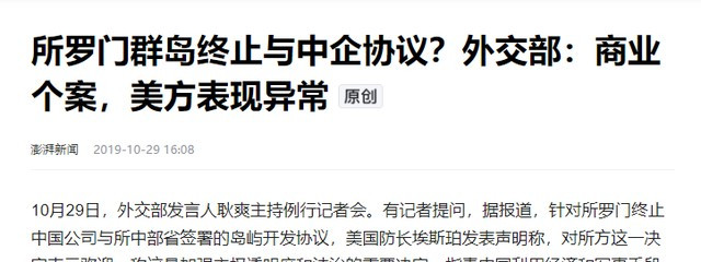 澎湃新闻2019年《所罗门群岛终止与中企协议?外交部:商业个案,美方表现异常》报道
