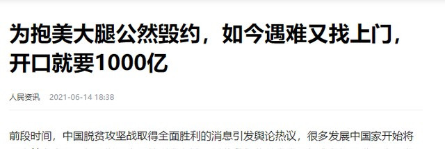 人民资讯2021年6月14日《为抱美大腿公然毁约,如今遇难又找上门,开口就要1000亿》报道